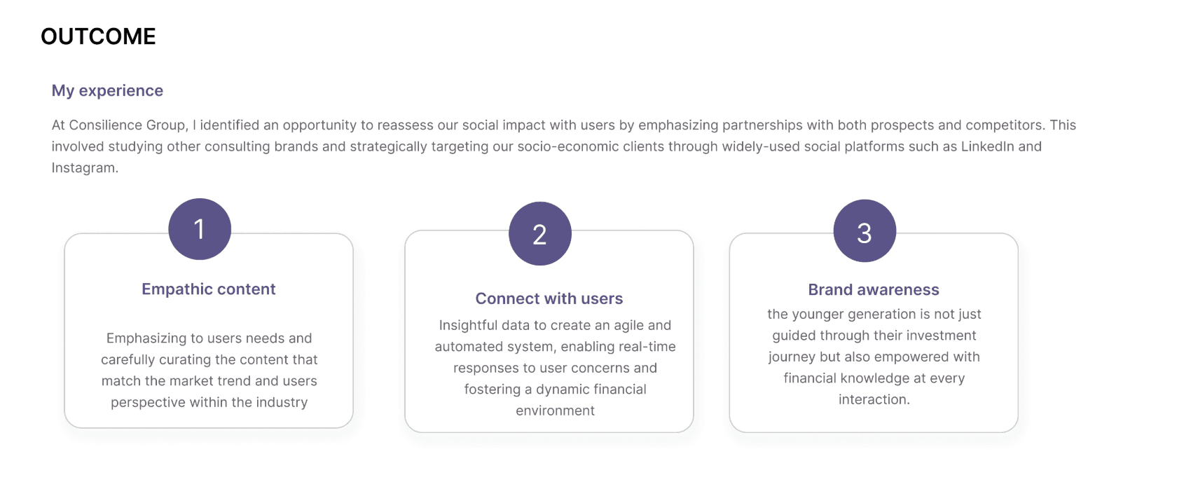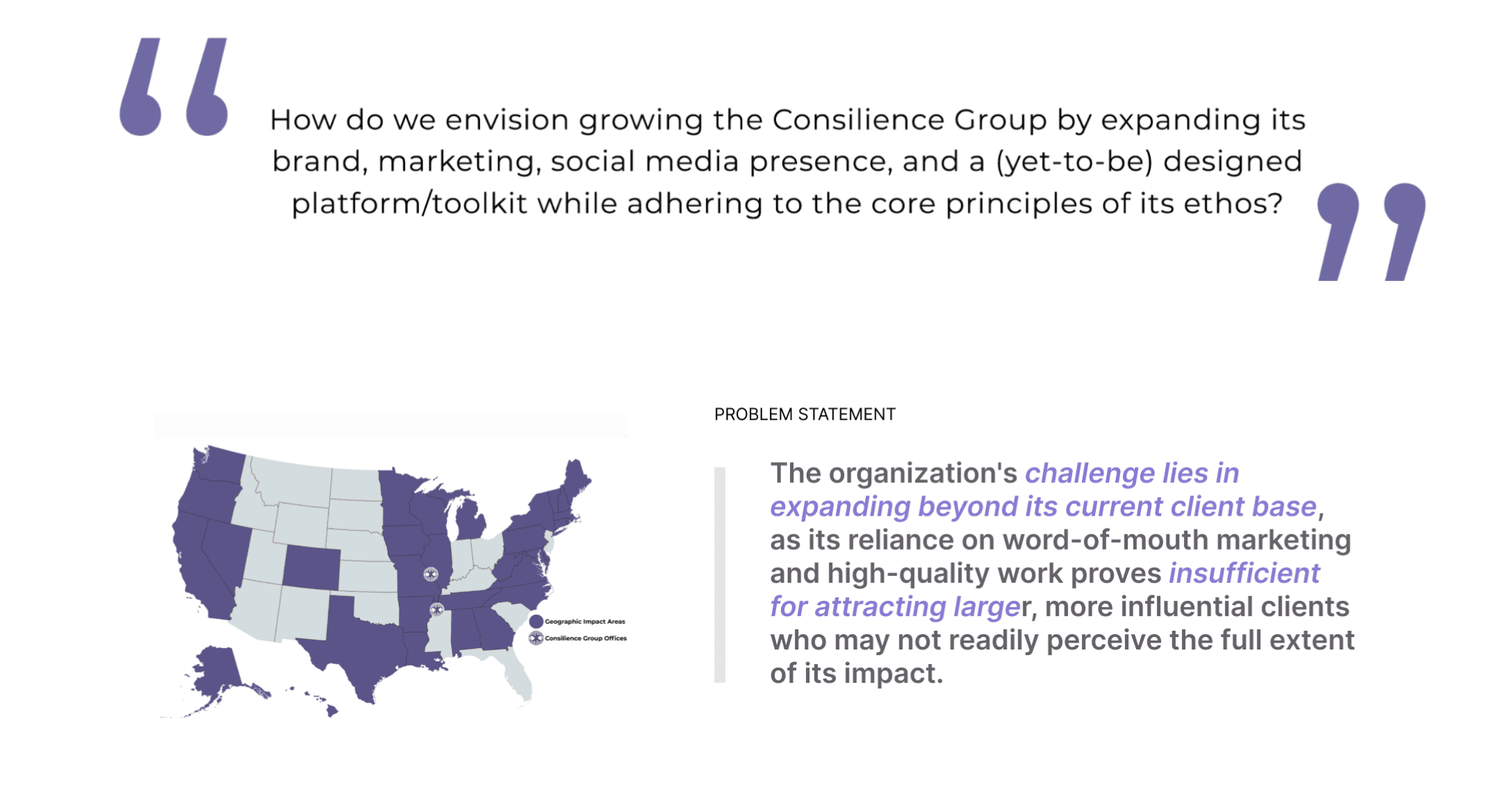 The project centers on developing a human-centric approach to enhance Consilience Group's online visibility while creating an accessible toolkit that enables prospective clients to connect meaningfully with the organization.