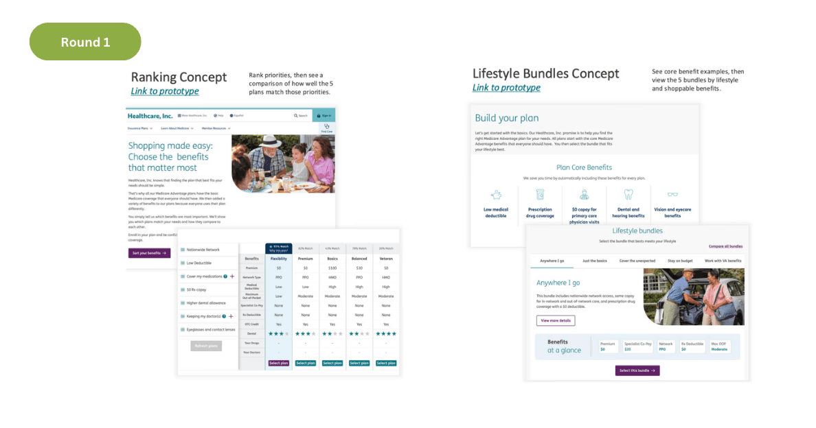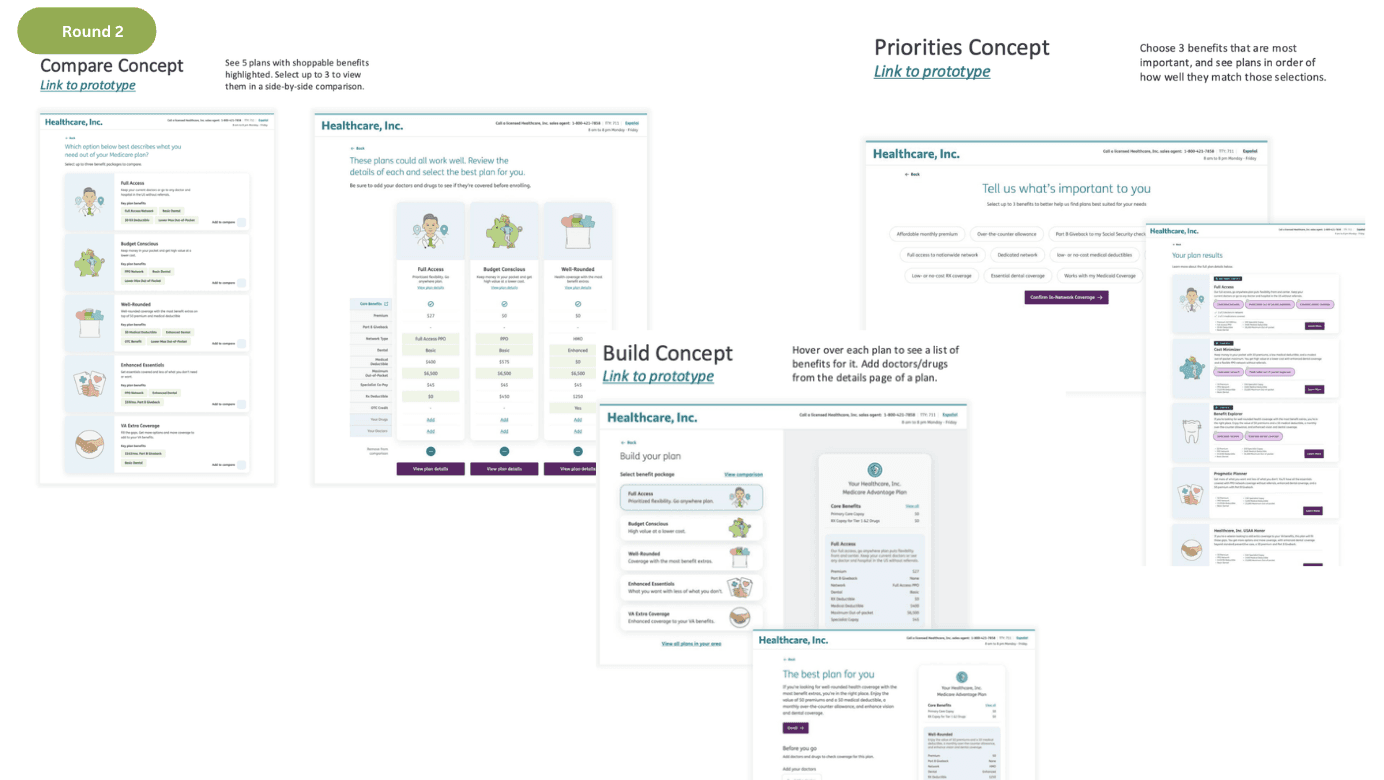 These two concepts emerged from careful observation of user behavior and psychology during Medicare plan shopping. User research revealed three critical needs: guidance through the selection process, upfront visibility of doctor/drug coverage to understand costs and benefits, and confidence that their chosen plan truly meets their healthcare needs.