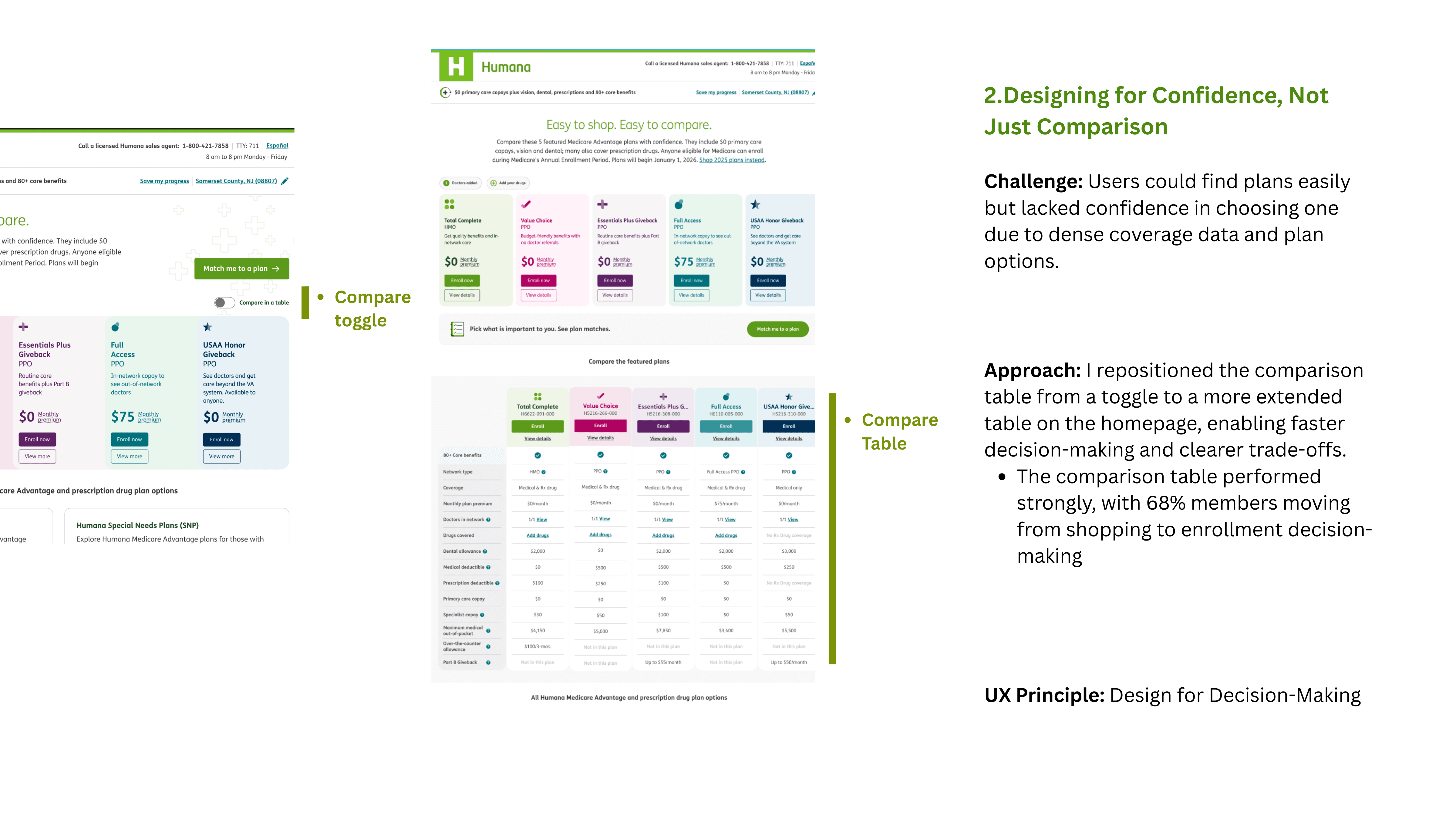 This complexity leads to decision paralysis, increased customer care dependency, and off-platform enrollment, breaking the end-to-end digital journey and driving higher operational costs for Humana.