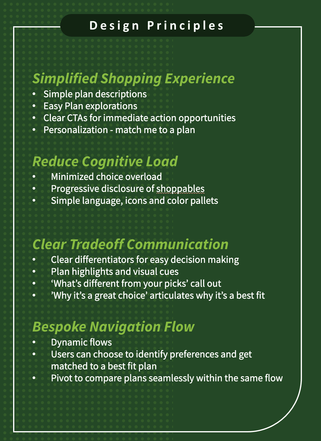 Before designing solutions, I anchored the project around four core principles: simplifying the shopping experience, reducing cognitive load, clearly communicating trade-offs, and enabling bespoke navigation flows. These principles guided how I framed discovery, structured information, and prioritized personalization and progressive disclosure.