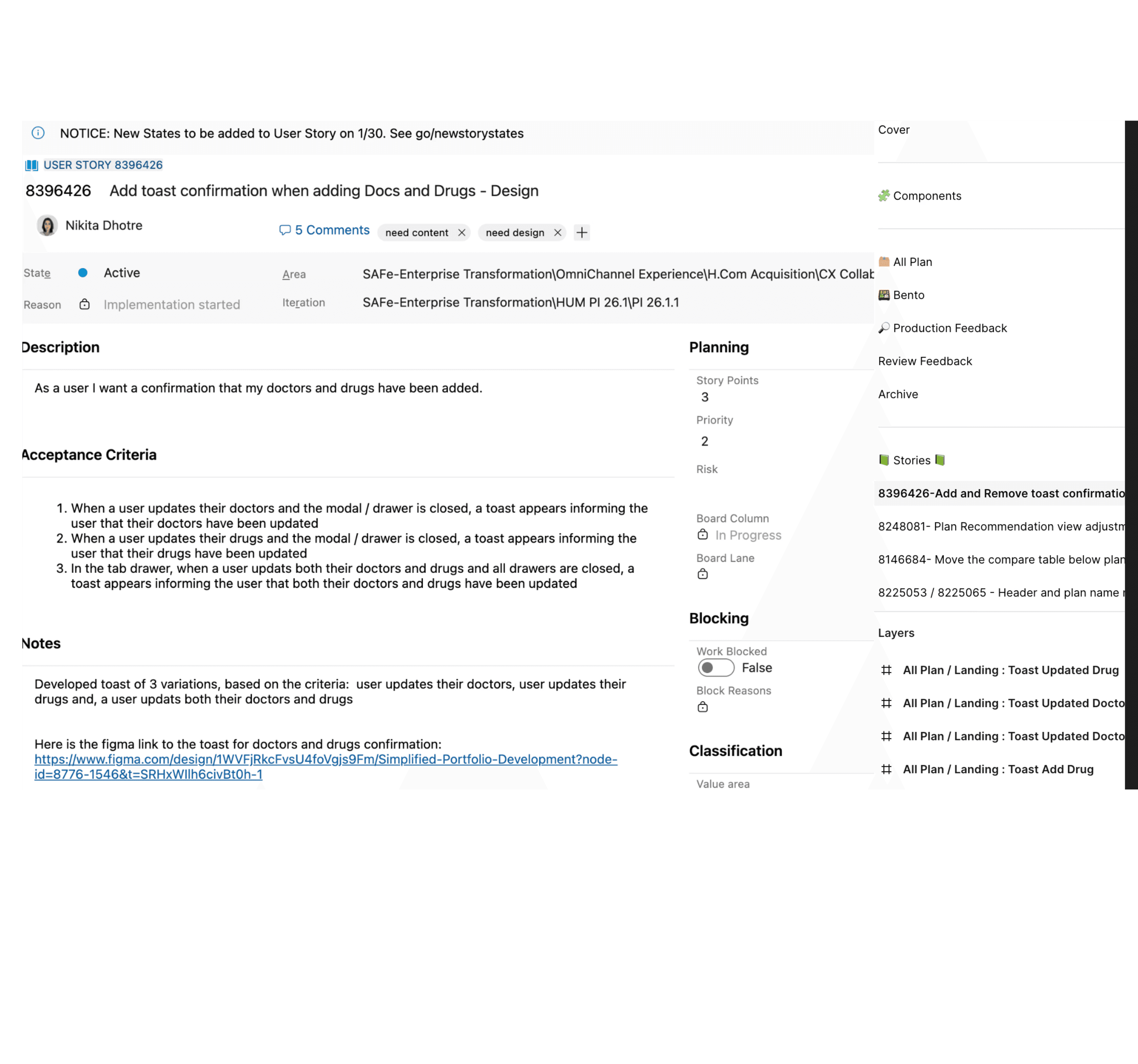 I collaborate closely with the development team through sprint-based workflows. Product Owners define sprint stories and acceptance criteria, and I translate those requirements into Figma designs, linking annotated designs directly to stories to ensure clarity, alignment, and smooth implementation.